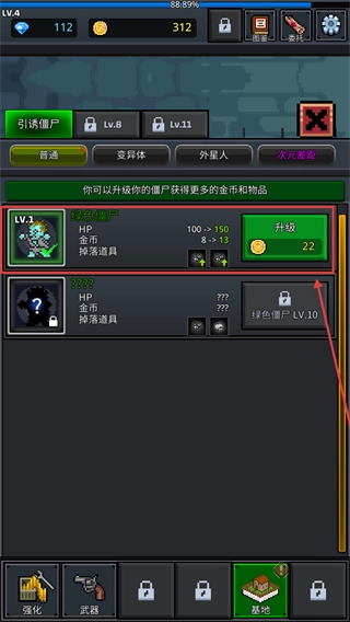 1、给【绿色僵尸】进行升级需要消耗22个【金币】,升级后它的HP会增加,掉落的道具也会提升,通过这样积累资源能为后续战斗提供帮助,从而快速巩固前期的生存根基。