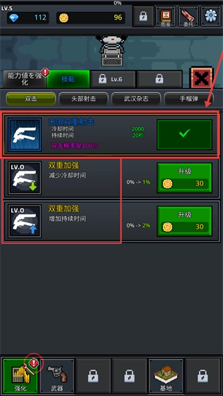 2、优先解锁【无限双重射击】技能,花费30【金币】升级【双重加强】以缩短冷却时间,提升射击效率来应对更多僵尸。