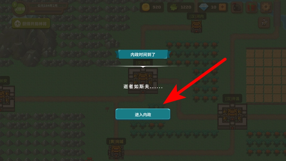 当界面弹出内政时间已到的提示时,点击进入内政板块即可打开内政管理界面,这是推进城池内政建设的重要操作,借助该界面能够解锁官职任命、资源调配等核心内政功能。
