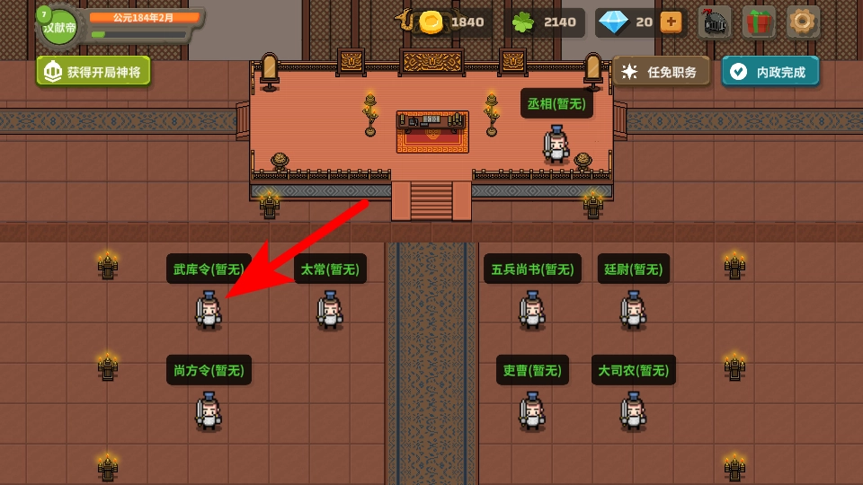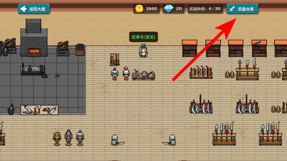 2、在大殿内点击武库令对应的职位区域,即可进入武库功能界面,这里是管理武器装备的核心入口,后续诸如装备打造、资源管理等与战力提升相关的操作,都需要通过该界面来推进。