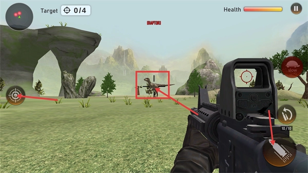 进入关卡后,留意【Target-0/4】的目标计数,对准【RAPTORI】,使用剩余的【10/10】弹药按下射击键发起攻击,与此同时关注【Health】的状态变化。