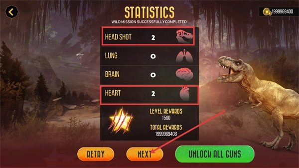 4、任务完成后,可进入【STATISTICS】界面查看【HEAD-SHOT-2】等相关数据,随后领取【LEVEL-REWARDS-1500】奖励,最后点击【NEXT】按钮进入下一关。