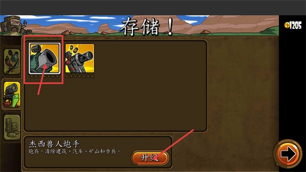 1、在存储界面选中【杰西兽人炮手】,它身为炮兵能够清除【建筑-汽车-矿山-步兵】这些目标,点击【升级】按钮可以增强它的作战能力,提升关卡中的输出效果。