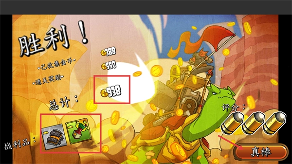 4、通关后可获得【已收集金币-388】和【通关奖励-550】,资源与战利品总计为【938】,点击【真棒】按钮即可完成结算。
