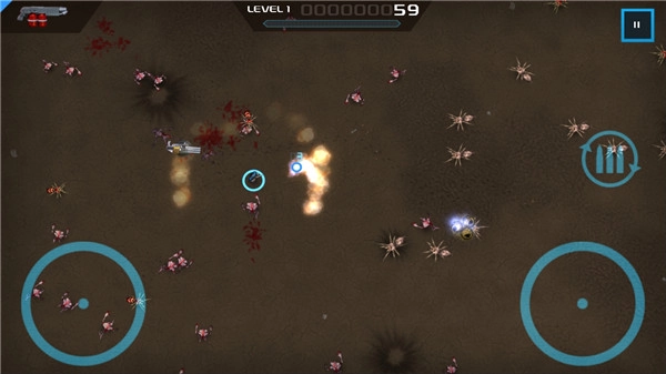 1、画面:这是一款采用2D俯瞰视角的射击游戏,画面呈现出绚丽的视觉效果,战斗场景中“血流成河”的氛围也得到了充分展现。虽然角色的体积相对较小,但这一设计反而让游戏的战场范围显得更为广阔,敌人一波接一波的密集袭击,更让整场战斗充满了震撼的气势。