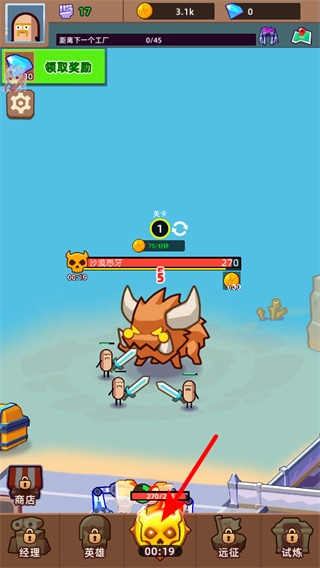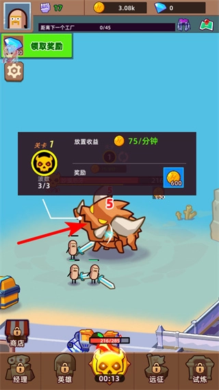 2、游戏中依照箭头指引,点击挑战boss按钮,可触发当前关卡的BOSS战,获取对应的挑战奖励。