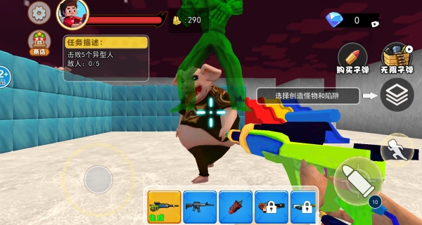4、一开始会有10颗子弹,得精准瞄准再开枪,只要击败5个异型人就能完成当前任务目标,让冒险继续推进下去。
