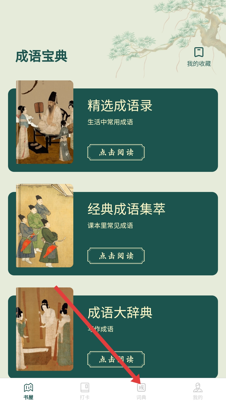 1、进入成语书屋首页后,点击底部【词典】选项,可进入成语词典板块查询成语。