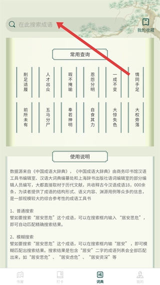 2、在词典页面,点击顶部【在此搜索成语】搜索框,可输入想要查询的成语进行搜索。