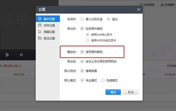 2、点击右上角的“设置”选项,进入基本设置页面后,取消“播放时使用硬件编码”的勾选,然后完全退出快剪辑并重新启动,查看该问题是否仍然存在。