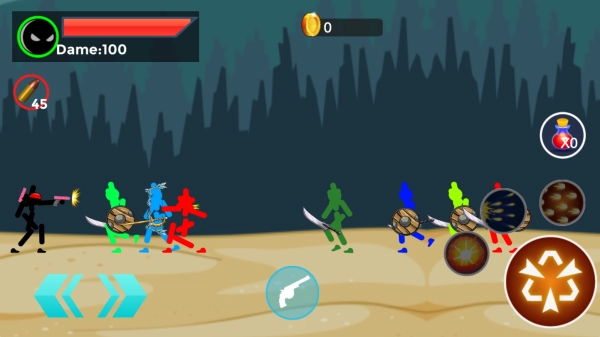 2、左侧方向键用于操控火柴人的移动以及调整攻击方向,右侧按键承担普通攻击与释放各类华丽技能的功能,巧妙组合这些按键能够打造出极具威力的连招。