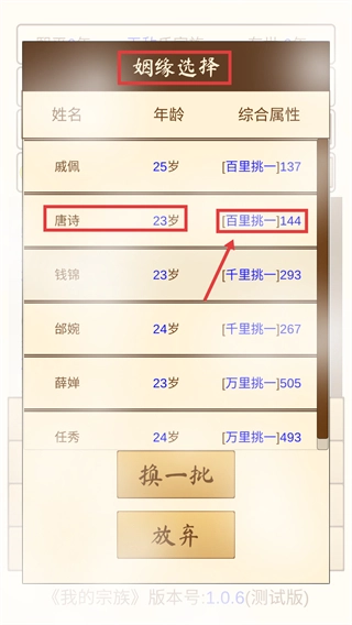 3、在【姻缘选择】界面,可查看【唐诗-23岁】对应的【综合属性-144】,选择适配的配偶助力宗族发展。