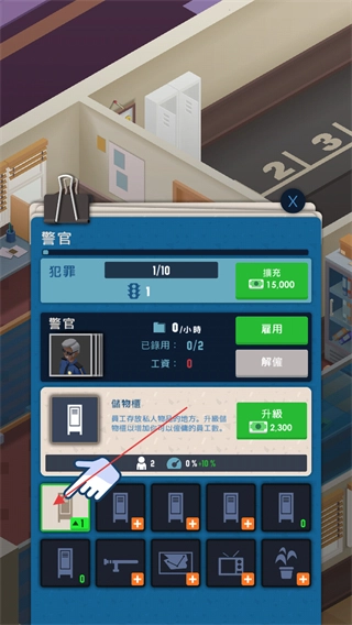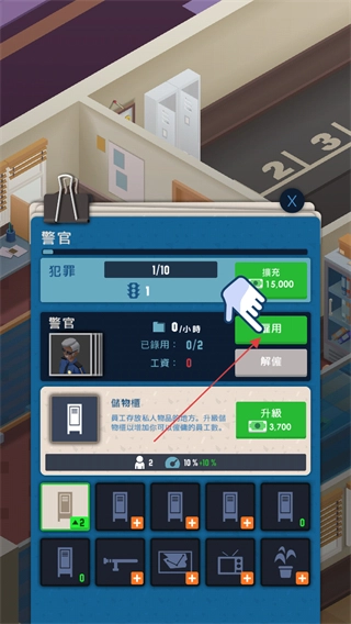 3、点击雇用按钮可以招募警官进行办案,但要消耗货币付相应的工资。