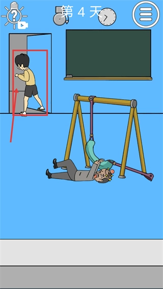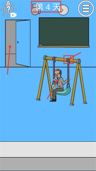 1、在【第4天】场景中,先点击秋千右侧的【螺丝】,使秋千结构松动,让人物失去平衡。