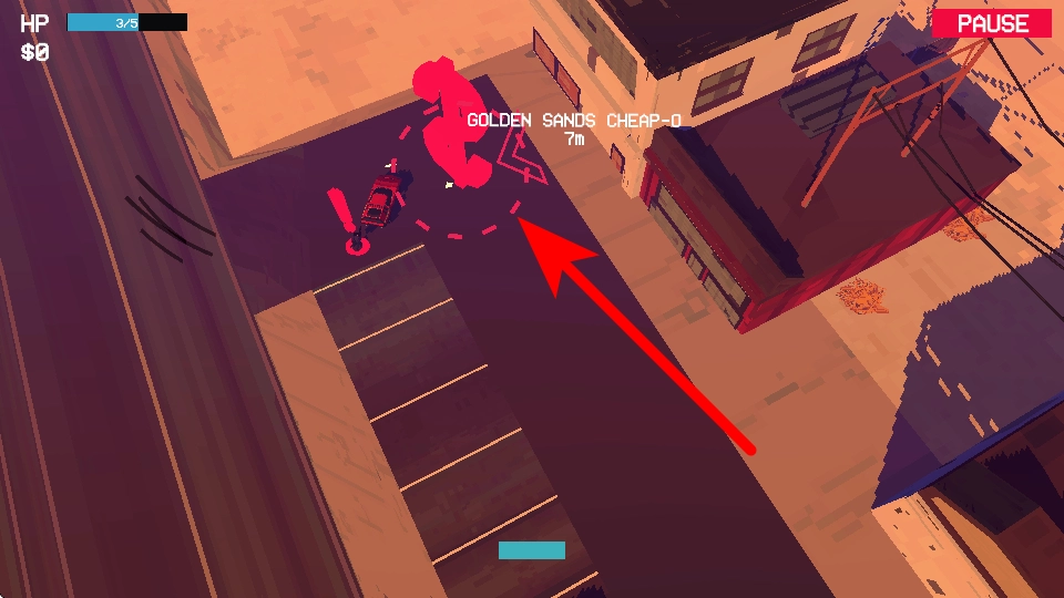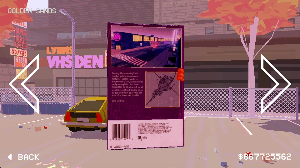 2、进入初始场景后,操控车辆朝着带有标注的目标区域(比如GOLDEN SANDS CHEAP-O)移动,这是推进游戏进程的核心操作;前往这些目标区域不仅能获取金钱之类的资源,还能解锁后续的路线。