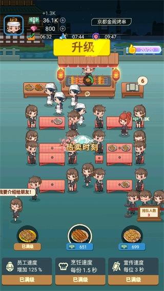 3、顾客用餐结束后,服务人员需要对餐桌进行整理和清扫。不过,要是能及时点击餐桌上的盘碟,整理速度会更快,这样就能接待更多顾客了。此外,游戏里的经营技巧可以通过升级下方功能来提升效率,像加快员工速度、提高烹饪速度、增加宣传速度之类的都可以实现。