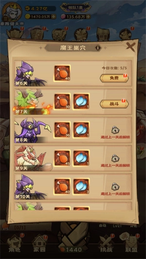 3、接下来就到了挑战魔王巢穴的阶段,这里有个非常关键的注意事项:不要一开始就把所有巢穴都扫荡完。正确的做法是优先进行升级,等升级遇到瓶颈、暂时升不动的时候,再把已经解锁的魔王巢穴全部打完,之后再去扫荡。如果不这么做,很可能会出现明明已经打到了最高等级的boss,结果扫荡次数却用在了第一个首领身上,平白浪费好几回战斗次数的情况。
