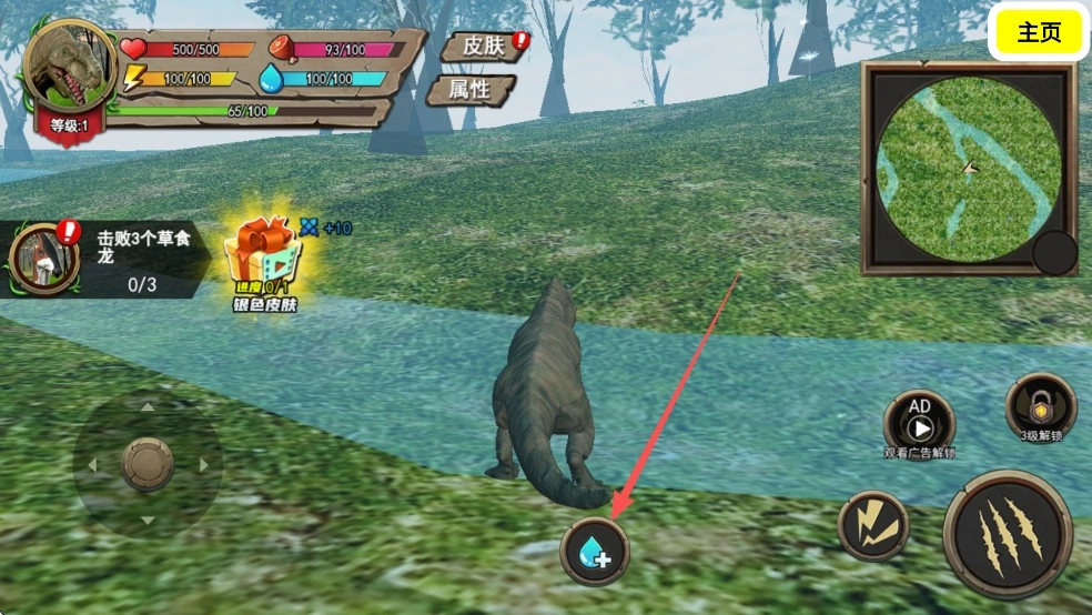 4、走到河边时,点击“饮水”按钮会让恐龙饮水;