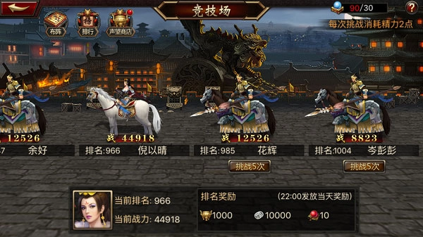 在挑战其他玩家以及每日结算时,你可以获得声望点数奖励。这些声望点数不仅能在声望商店里兑换各类资源道具,还能用来兑换稀有的橙将和红将碎片。