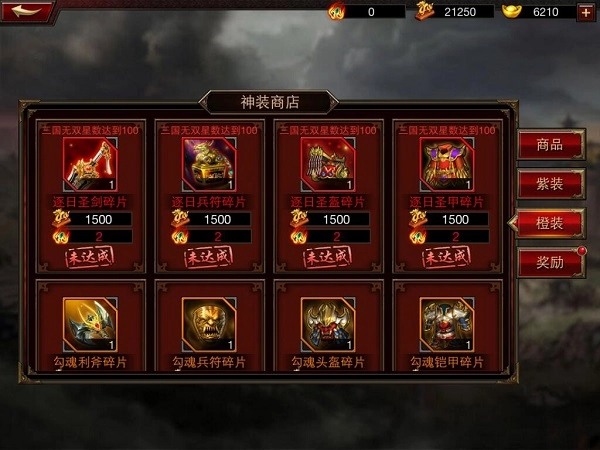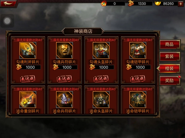 4、橙色与红色装备碎片就主要在三国无双的神装商店中购买。