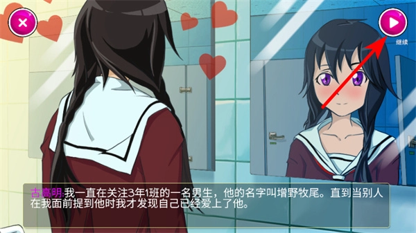 1、在剧情界面,点击继续按钮可推进故事内容,了解角色的背景设定如暗恋的对象,这是开启互动玩法的基础操作。