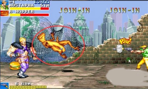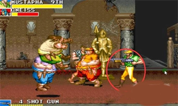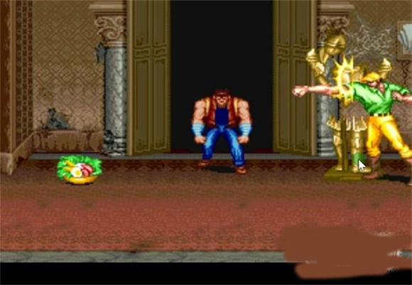 7、刚跳下城堡,对着正在下跳没有落地的胖子一个倒勾腿,可以让他再次飞天,定在墙上数秒。有一个特殊的点打死他后出来的大餐可以勉强带到关尾场景中作补血用。
