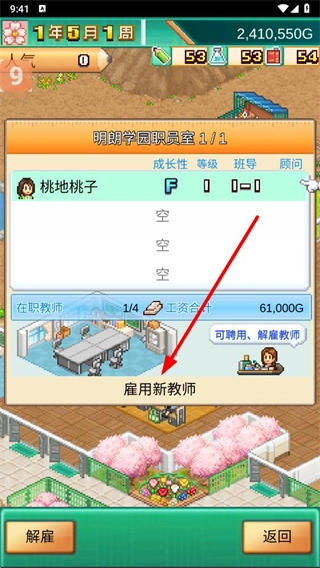 4、在职员室界面中,找到聘用新教师按钮并点击,系统会展示可招聘的教师列表。