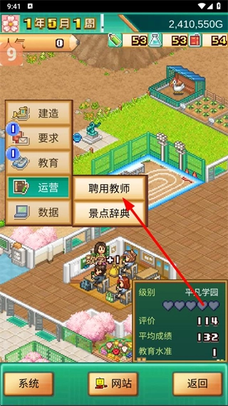 3、在运营页面的弹出选项里,选择聘用教师这一选项,点击后会进入职员室界面。