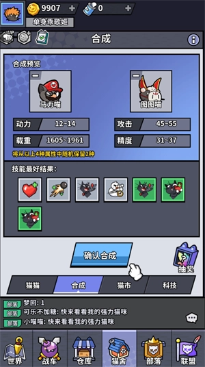 1、猫咪合成:游戏里的猫咪能够进行合成操作,它们的属性与技能存在继承概率,为玩家带来层出不穷的惊喜。