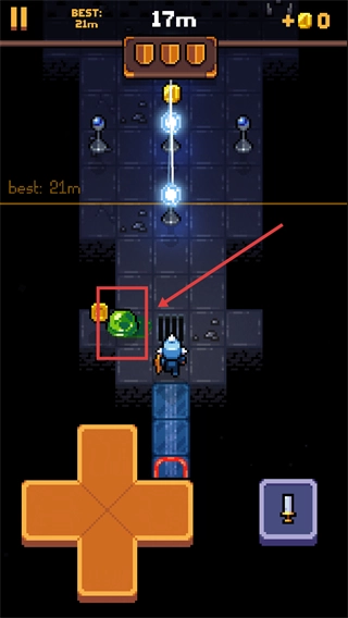 3、在地牢中移动时,要避开【绿色史莱姆】,收集路上的金币,同时留意脚下的尖刺陷阱,灵活控制角色移动来确保安全。