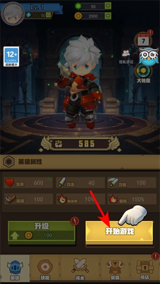 1、在角色界面查看英雄属性,确认当前的生命、攻击等数值后,点击开始游戏按钮进入关卡,这是开启冒险的核心步骤。