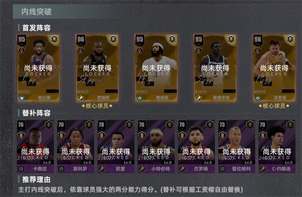 推荐理由:主打内线突破后,依靠球员强大的两分能力得分。(替补可根据工资帽自由替换)