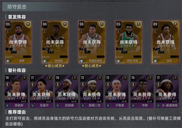 推荐理由:这套阵容以防守反击为核心打法,凭借球员出色的防守能力压制对手进攻,在对方进攻受挫后抓住机会反击得分。(替补球员可依据工资帽规则灵活调整)