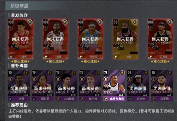 推荐理由:以篮下进攻为核心打法,凭借球星顶尖的个人实力,猛烈冲击对手防线,实现强硬得分。(替补球员可依据工资帽灵活更换)