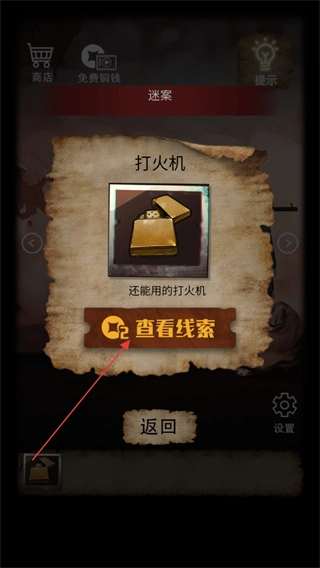 2. 进入迷案界面后,先在物品栏里选中打火机,接着点击界面上的查看线索按钮,就能消耗相应点数来获取该物品的相关线索。