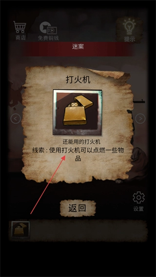 3.查看打火机的线索后,可得知其线索为使用打火机可以点燃一些物品,明确该道具的功能以辅助后续探索操作。