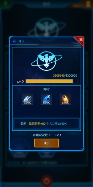 每位指挥官都能在势力界面点击“升级”按钮来建设所属势力,每天最多可进行11次势力建设。首次建设是免费的,之后的每次建设都需要消耗一定量的金属、晶体与能源,且建设次数越多,消耗的资源数额就越大。不过相应地,指挥官能获得的个人功勋奖励会呈几何级数增长,本国势力也能持续获得势力经验。