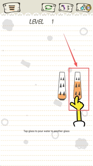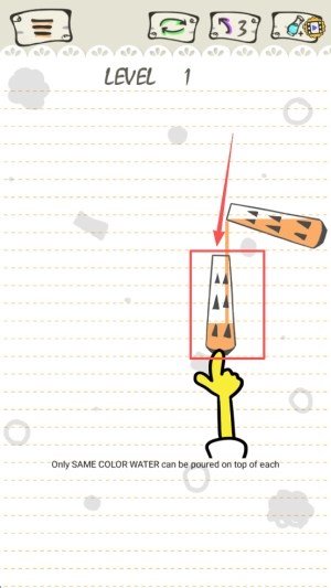 1、解谜准备启动:选定目标关卡,查看初始瓶子里的色彩排布情况,掌握一指滑动的操作逻辑,清晰确立“同类颜色归置一处”的核心任务。