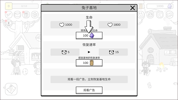 2、教程结束后,我们先回到最初的兔子以及它左手边的兔子那里,为游戏闯关提前做好战斗准备,比如升级基地、抽取战斗兔子。