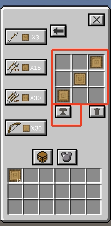 5、右侧的方格中会出现已摆放好的木块,点击方格右下角的符号,木块消耗后便会消失,如此就能成功制作出一支箭。