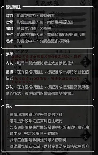 3. 精彩战斗系统:战斗机制脱胎于井字棋,上手容易但精通不易。玩家通过连接OX图案来施展外功招式,战斗时要依据战局动态调整攻防策略,同时还需提前搭配好外功与内功,策略性极强,过程充满变数。