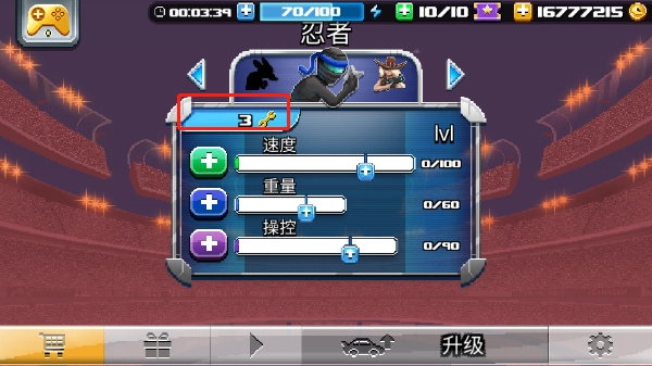 6、而升级点可在下图所示位置,提升角色速度、重量、操控等各项属性