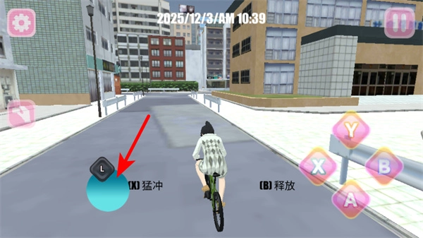 1、骑行自行车时,按下左侧相应按键可激活猛冲功能,以此提高移动速度,便于快速穿行城市道路,在此过程中需留意观察路况,防止与场景内的障碍物发生碰撞。
