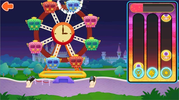 5、借助音乐游戏为摩天轮点亮浪漫绚烂的灯光与烟花吧~当下方的下落块和圆形图标重合时,赶紧点击对应的图标试试看吧;