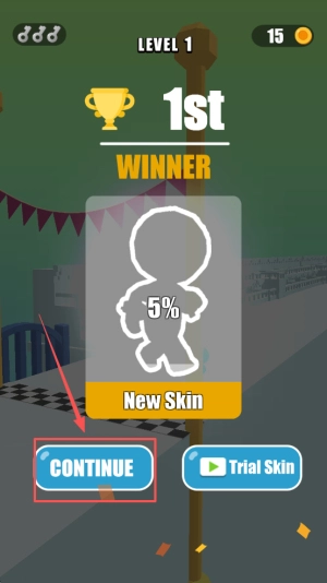 4、完成通关:在LEVEL 1 15 1st WINNER 5%界面点击CONTINUE领取新皮肤。