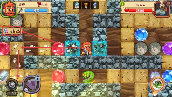2、操控【查克】在5米矿洞内进行挖掘作业,当前宝石收集进度为【21/25】,镐子剩余耐久值为【30】。在此过程中需留意【狗头人】类型的敌人,保持持续开采以推进宝石收集进度。