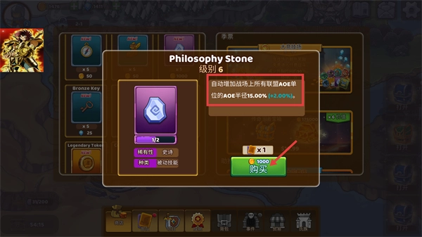 1、可消耗1000货币获取【Philosophy-Stone】(等级6),该物品为被动技能,能够自动提升战场上联盟AOE单位的AOE半径15.00%(+2.00%)。