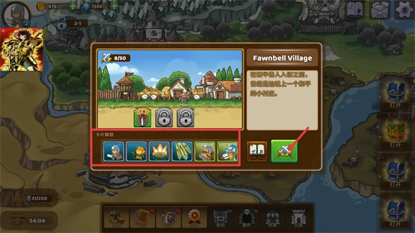 2、进入【Fawnbell-Village】后,需先完成卡片解锁任务,获取相应卡牌以优化队伍配置,从而更好地应对该村庄面临的半兽人入侵挑战。