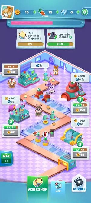 3、不断扩大你的厨房规模,解锁更多烤箱、搅拌机与制作台,让生产更高效。