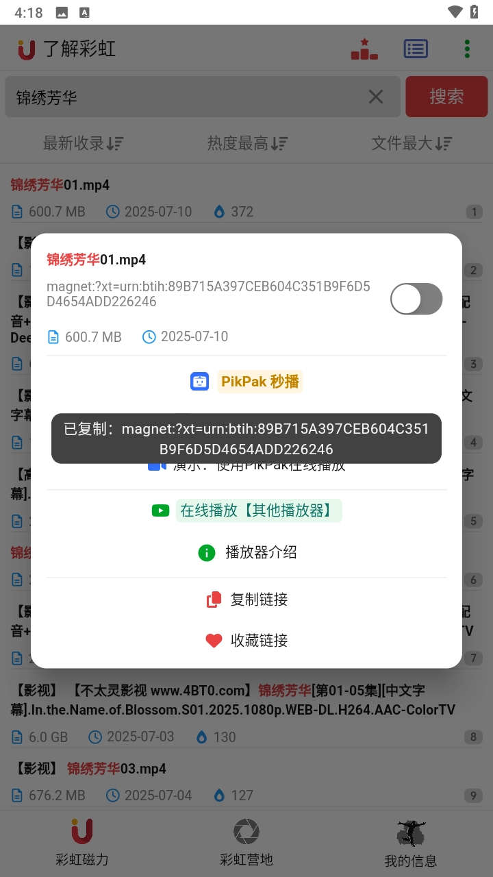 彩虹磁力官网版,兼容迅雷、115、PikPak等各类网络云盘磁力链接。无论是影视、软件、漫画、小说、学习资料还是游戏,都能在这里找到。它具备强大的磁力嗅探功能,无需任何额外付费步骤,资源获取速度十分快捷。